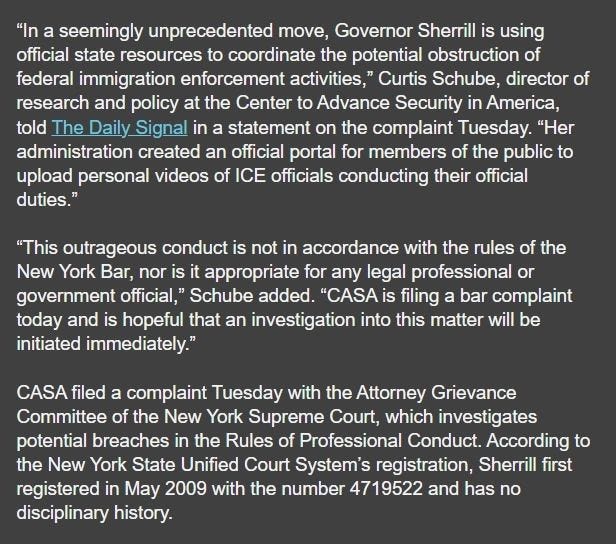 On Tuesday, in The Daily Signal, O’Neil reported that Governor Mikie Sherrill “faces an ethics complaint after she asked Garden State residents to report on Immigration and Customs Enforcement to the state government.” The story continues: